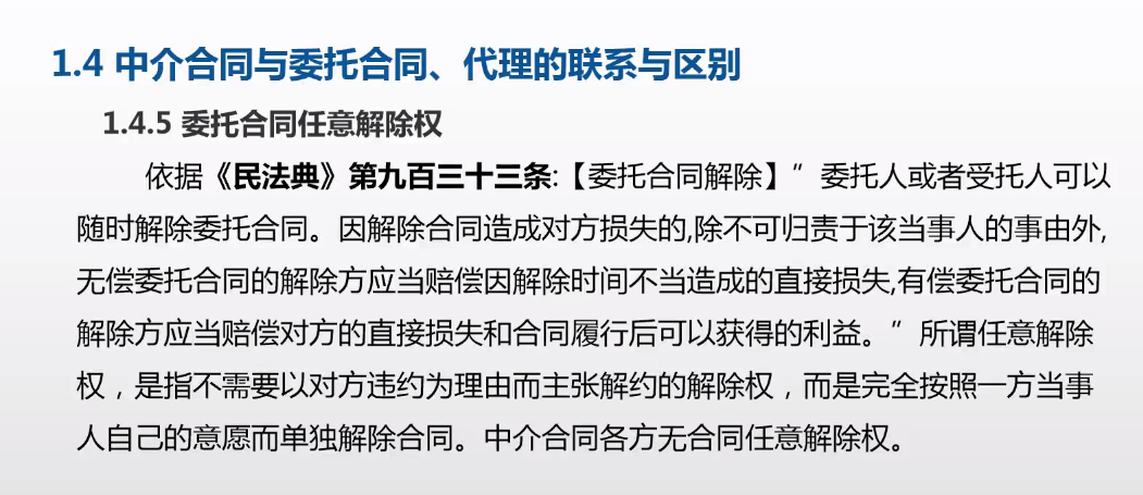 1.4 中介合同与委托合同、代理的联系与区别1.4.5 委托合同任意解除权